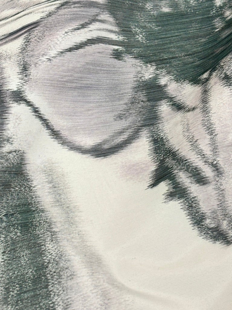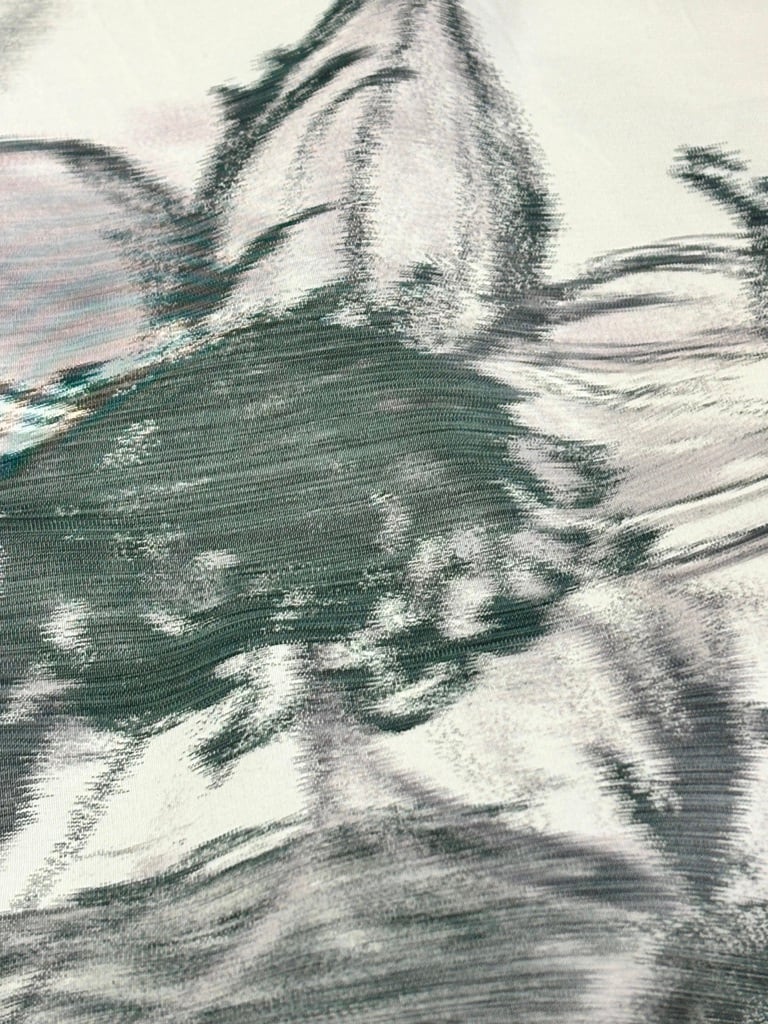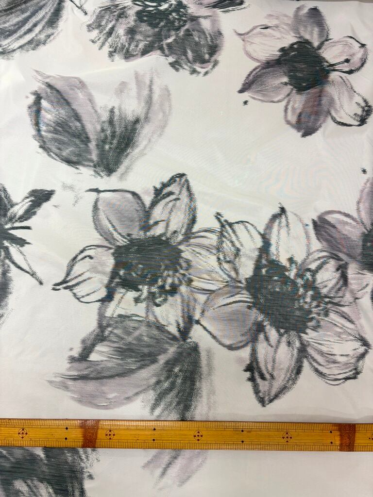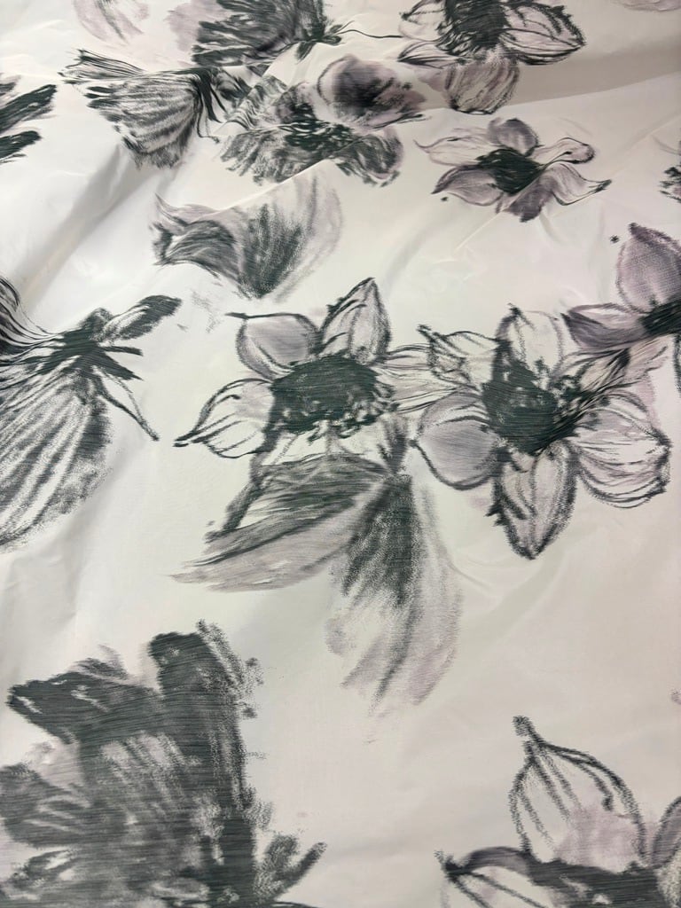 大胆なビッグフラワーモチーフを、ホグシ(かすれ)調の表現で仕上げた印象的なプリント生地。