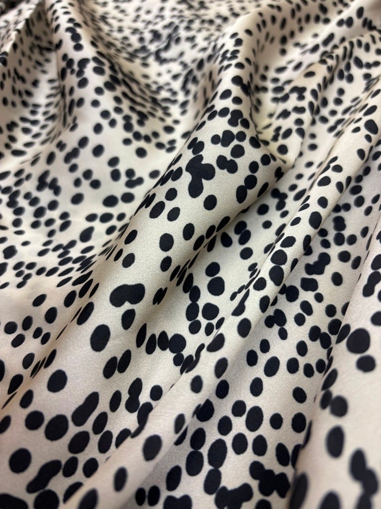 不規則に並んだドット柄が印象的な、表情のあるプリント生地。