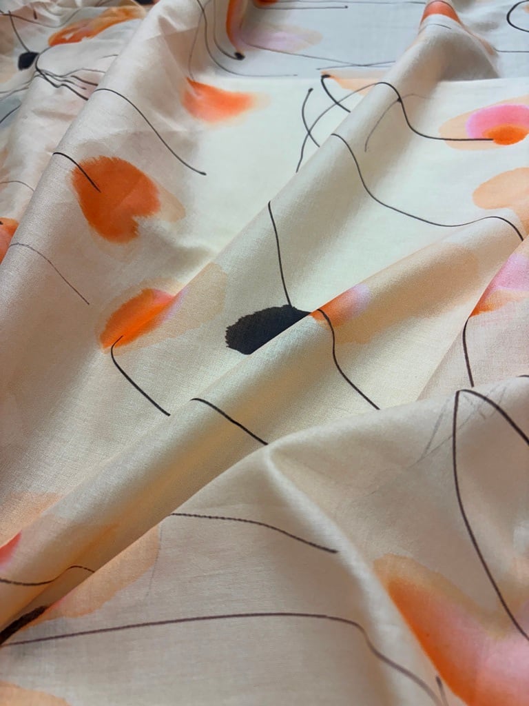 軽やかなコットンボイル素材に、やさしいタッチのフラワーモチーフをあしらったプリント生地。