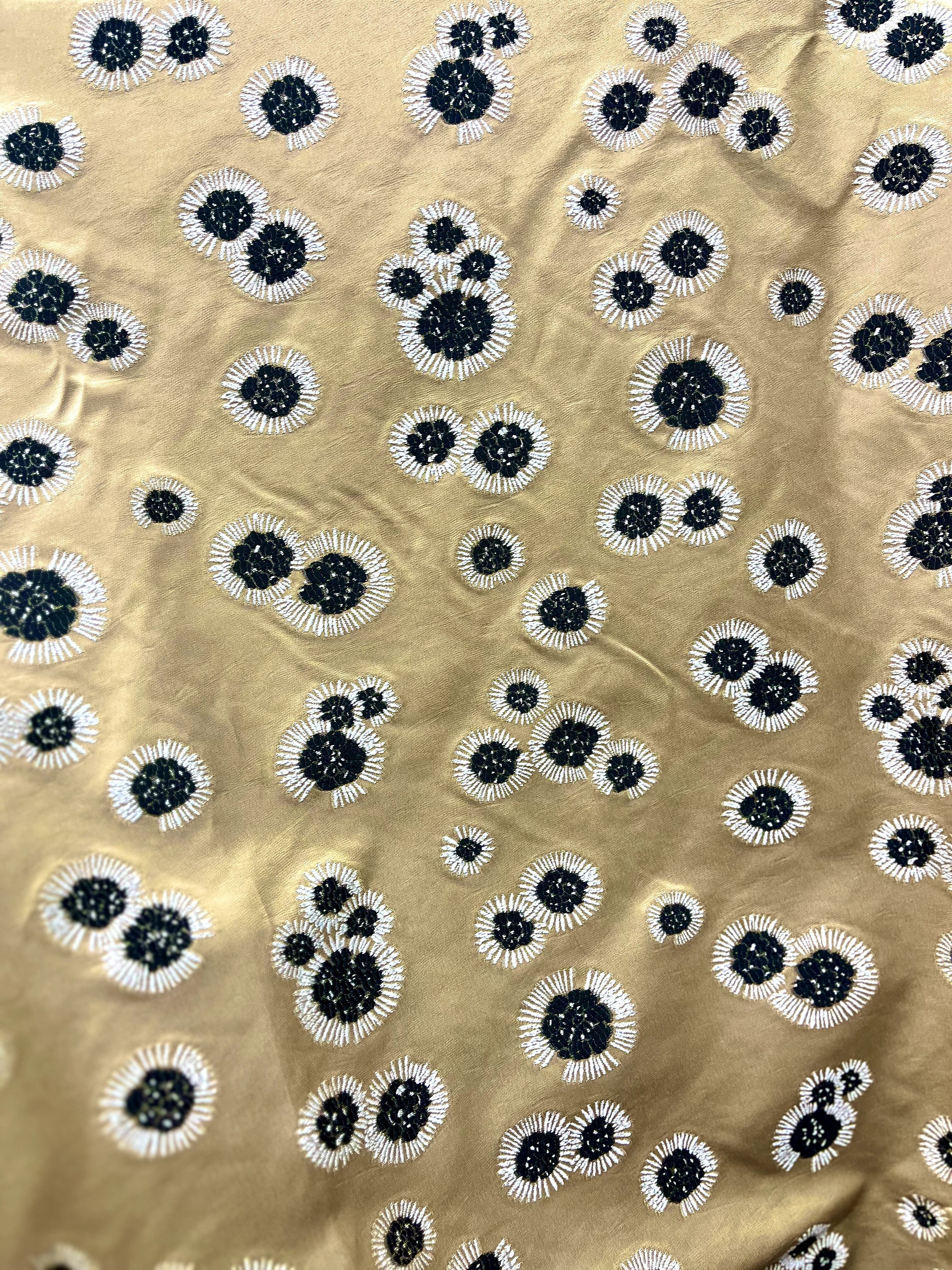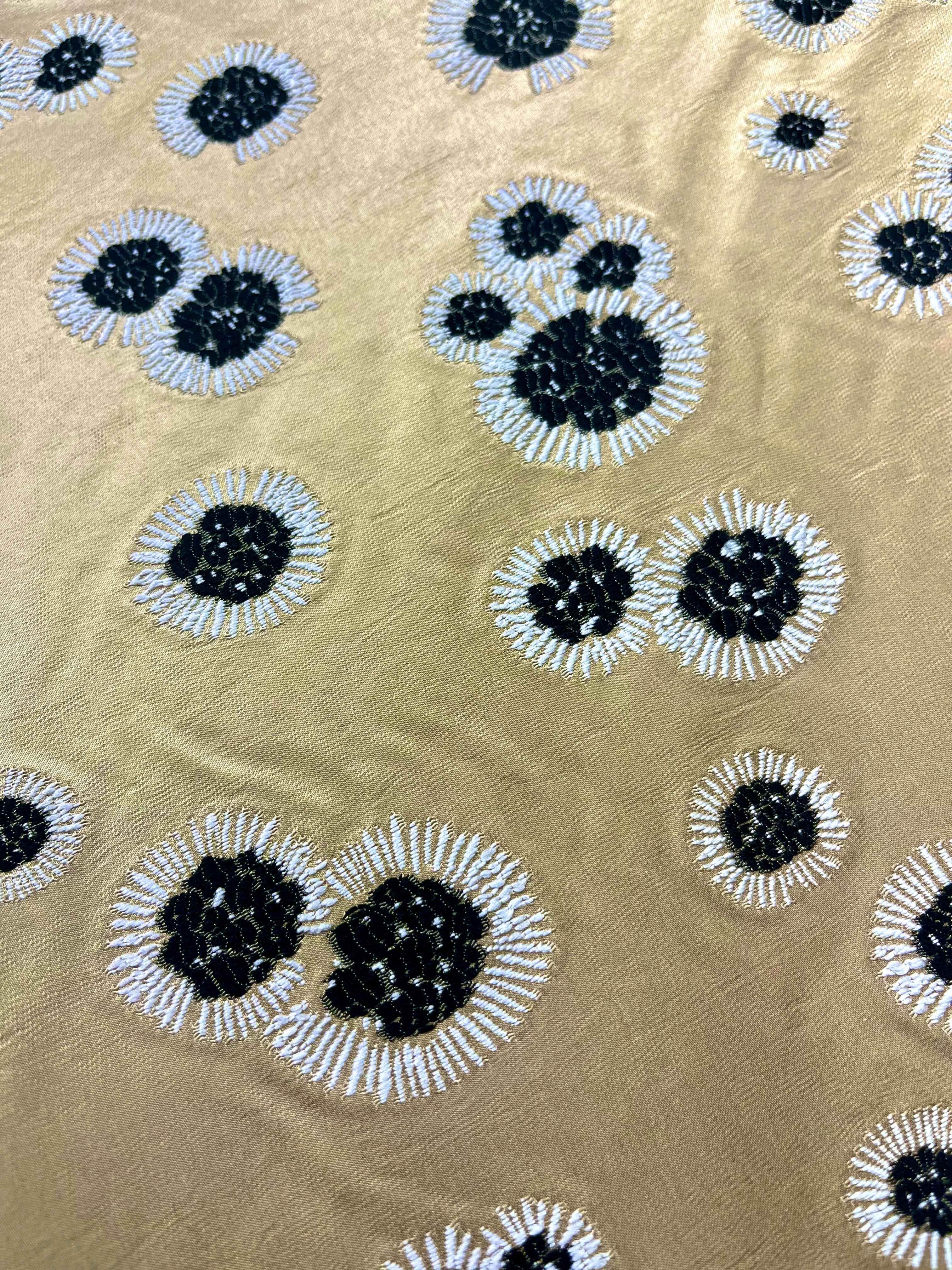 ゴールドでサテンの滑らかな光沢とドット柄が美しい、サテンドットジャガード生地。